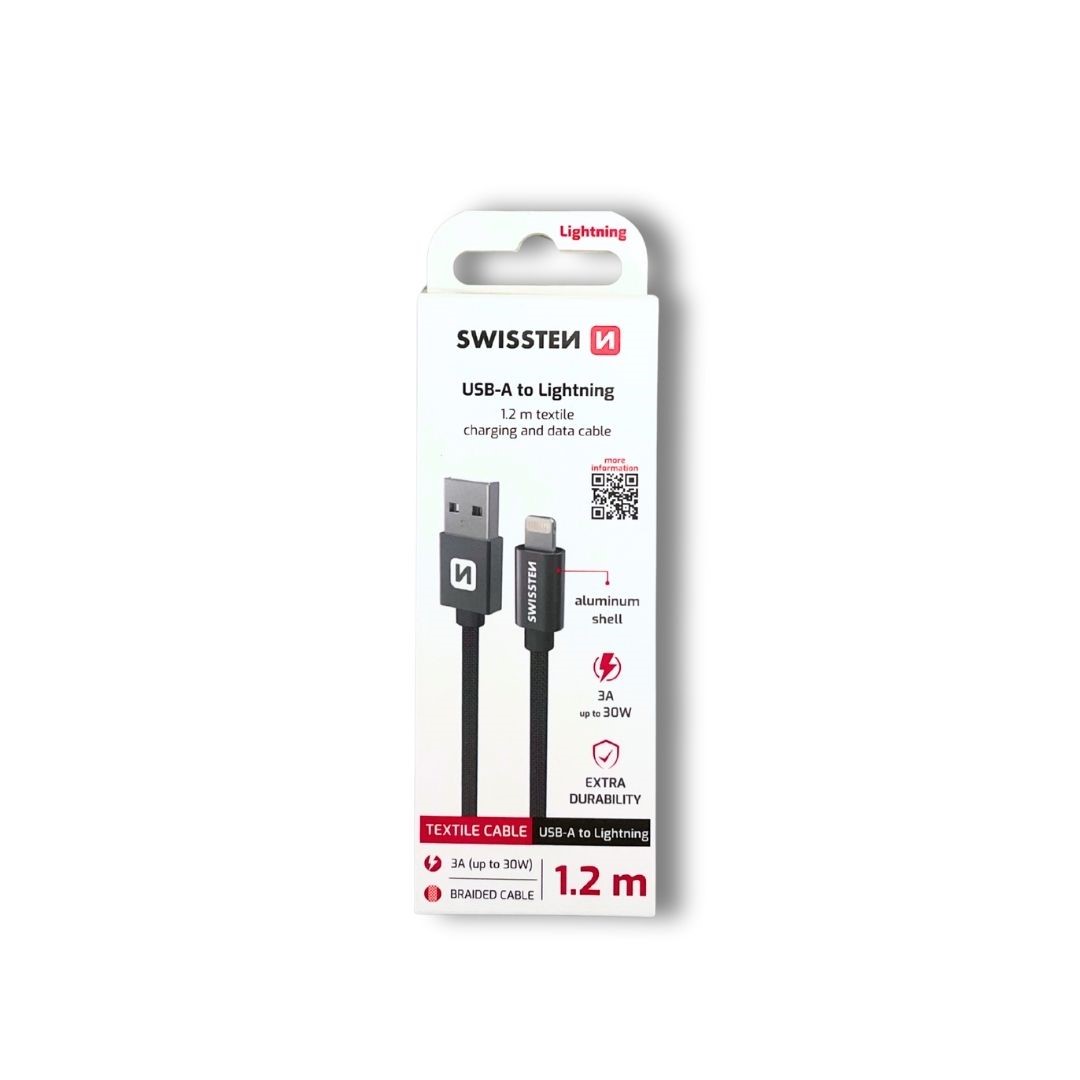 Dátový kábel Swissten USB/Lightning s kvalitným textilným opletením. Vďaka dĺžke 1,2m je vhodný do auta, na stôl v kancelárií alebo na nočný stolík. Kábel je zosilnený a prenesie tak väčší prúd (až 3A) a zvládne i rýchli prenos dát 480 Mb/s.